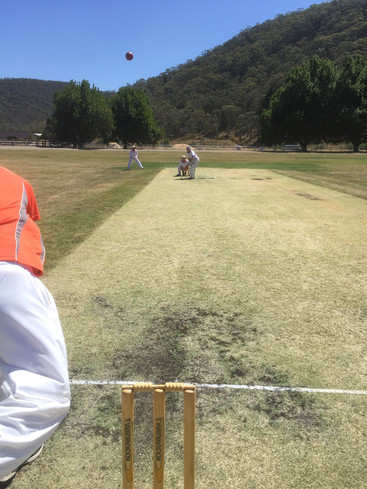 A 10am start was always ambitious for sensible drivers to the Over The Hill settlement of Lithgow but we were greeted at the main show ground by a massive three squared domain with a former Trots track round the perimeter and allegedly the biggest amateur grandstand in NSW. We were blessed to find the air clean and the sky blue with a slight westerly breeze and a grassy strip. It would be wrong to call it green as the local curators have been stressed at the lack of rain so play commenced around 1030 and Port won the toss and elected to bat against the Side with the Orange Shirts, although they had recently renewed the design with a white base.